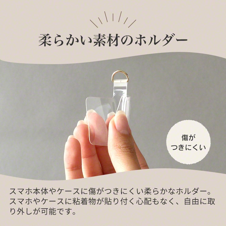 ホルダーは柔らかい素材なので大切なスマホやケースに傷がつきにくくなっています。また粘着物が貼り付く心配もなく、自由に取り外しができます。
