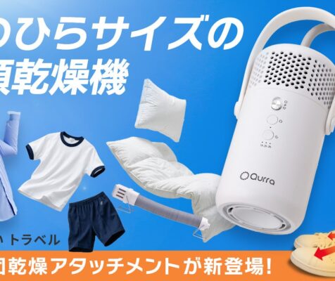 新商品【シリーズ累計約2万7千台突破】手のひらサイズの衣類乾燥機「Qurra ぽけどらい トラベル」に、雨の日の靴も布団もふかふかにする『靴・布団乾燥アタッチメント』が新登場!Makuakeで先行販売開始!